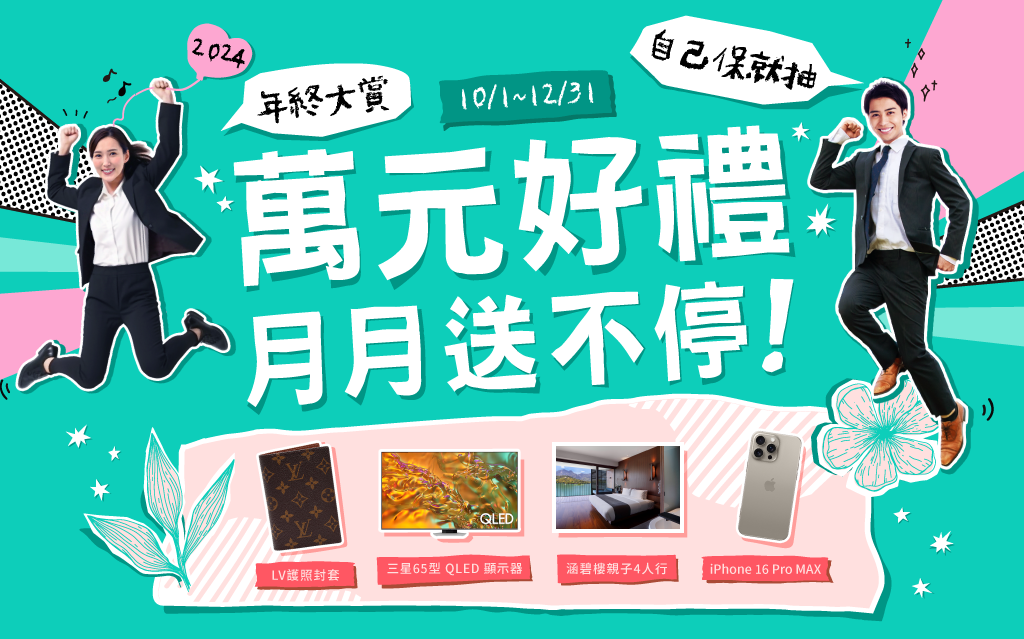 - 【投保月月抽】10月投保旅遊不便險(不限國內外與方案,單筆保費滿800元即可),就抽涵碧樓親子4人行一泊二食(市價約 44,330元,抽1名)。