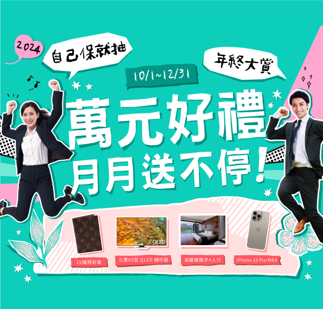 - 本活動所有獎品,非保險契約內容一部分,保險契約之權利義務,由本公司依保單內容履行。本公司與各該獎品或服務廠商間無代理關係或類似關係。