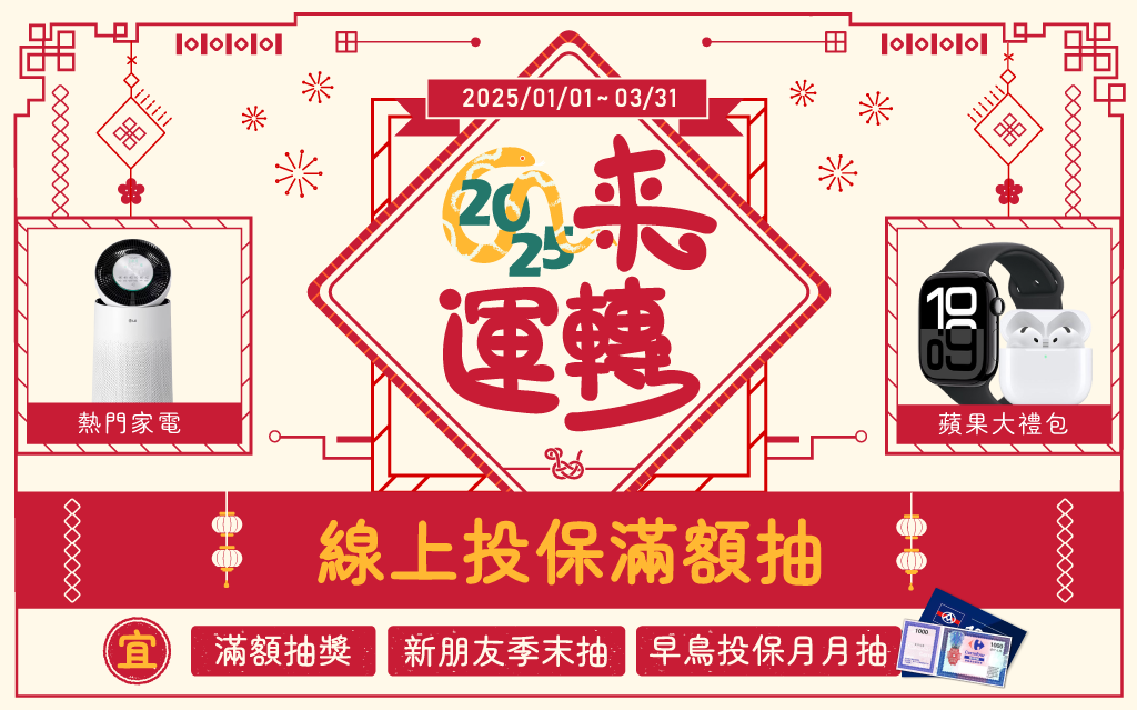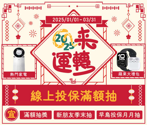 抽獎條件:活動期間內於明台官網首次註冊會員,並於線上投保下列任一指定門檻,即可獲得抽獎資格。